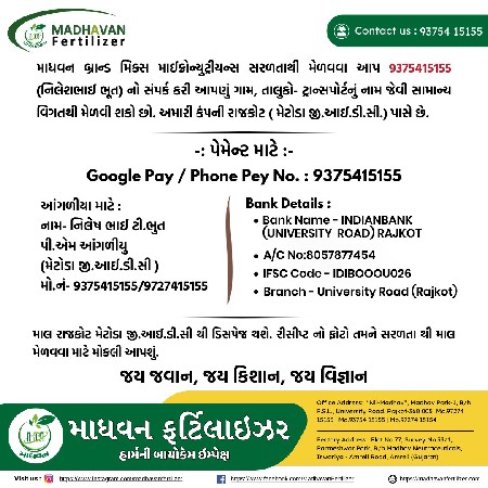 માધવન એમીનો પ્લસ ➡️ છોડની ગર્ભધાન પ્રક્રિયાને સુધારી હરિતદ્રવ્ય સંશ્લેષણ કરે ➡️ છોડનું જીવાતોથી રક્ષણ કરે, રોગ અને ટ્રેસનું નિવારણ કરે ➡️ ફળને પકવવાનું તેમજ સુંદર રંગ અને આકાર આપવામાં મહત્વનો ભાગ ભજવે ➡️ છોડની અંદર ટ્રાન્સપોર્ટરનું કામ કરે જે પોષક તત્વોને એક જગ્યાએથી બીજી જગ્યાએ લઇ જવામાં મદદરૂપ થાય --------------------- માધવન સિવીડ પ્લસ ➡️ સામુદ્રિક વનસ્પતી હોવાથી સંપૂર્ણ ઓર્ગેનિક મેટર છે ➡️ વાદળછાંયા વાતાવરણમાં પણ પાકની પ્રકાશસંશ્લેષણની પ્રક્રિયાને સુવ્યવસ્થિત રાખે છે. ➡️ છોડનો વિકાસ વ્યવસ્થિત થતા ઉત્પાદનમાં અને ક્વોલીટીમાં ફાયદો થાય છે. --------------------- માધવન મિક્સમાઈક્રોન્યુટ્રીયન્સ ➡️ ઝીંક, સલ્ફર, ફેરસ, કોપર, મેગેનીઝ, બોરોન, મેગ્નેશીયમ જેવા તત્વોનો સમુહ છે. ➡️ ગુણવત્તા યુક્ત પાક અને વધુ ઉત્પાદન ➡️ પાકને ચમકદાર અને વજનદાર બનાવે છે ➡️ પાકનાં ફળ - ફૂલનાં ખરવાનો પ્રશ્ન હલ કરે છે. ➡️ પાકને સુકાતો અટકાવે છે અને ફલાવરીંગમાં વધારો કરે છે ➡️ ડોઝ : વીઘે – ૫ કિલો / એકરે ૧૦ થી ૧૫ કિલો | લીક્વીડ : લીટરે ૩ થી ૪ ML એટલે કે પંપે ૪૦ થી ૫૦ ML. --------------------- માધવન માઈકોરાજાવામ ➡️ જમીનને ભરભરી બનાવવાનું કાર્ય કરે છે. ➡️ પોષક તત્વોની લભ્યતામાં વધારો ➡️ તંતુમૂળનો સંપૂર્ણ વિકાસ ➡️ જૈવીક અને અજૈવિક તણાવથી રક્ષણ ➡️ જમીનજન્ય રોગ સામે રક્ષણ ➡️ ડોઝ : એકરે ૧૦૦ ગ્રામ ➡️ કોઇપણ કેમિકલ ખાતર જોડે મિક્સ કરી શકાય છે. --------------------- માધવન મિક્સમાઈક્રોન્યુટ્રીયન્સ
